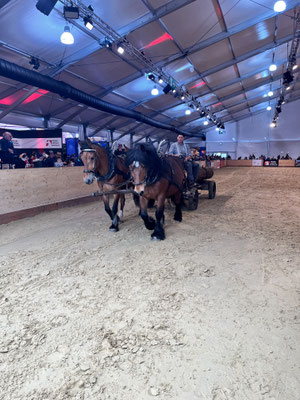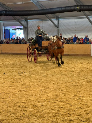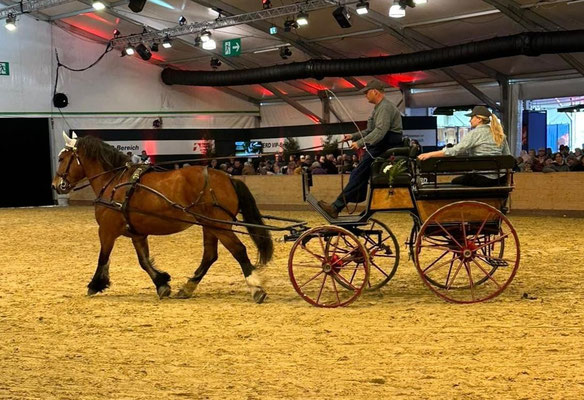 30.04.2025 Mittwoch: Heute spannten Marius, Jürg, Celine und Manuela am Abend Aurora das erste Mal an die Kutsche und fuhren nach der Öffnungszeit der BEA in der grossen Arena. Aurora war davon unbeeindruckt und so entschieden sie, dass Aurora ab Donnerstag den letzten Part für die Kutsche übernahm, da Fiona der Rest der Woche anderweitig eingesetzt wurde.